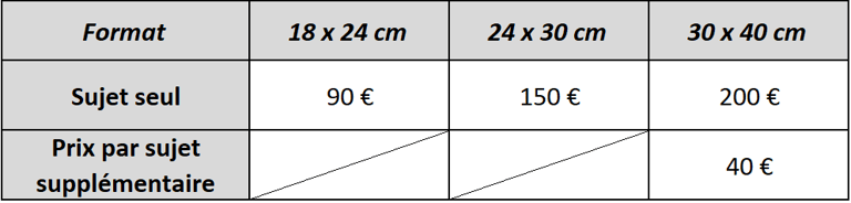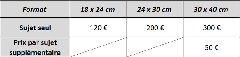 Mes tarifs sont indiqués à titre indicatifs et sont calculés en fonction de la technique utilisée, de la dimension du projet et du nombre de sujet.